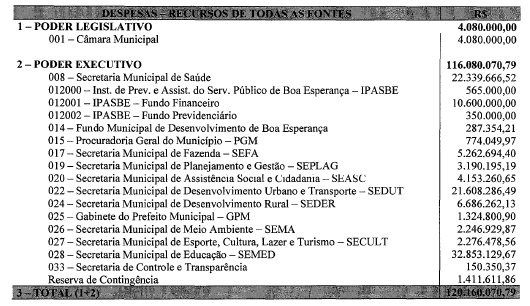 Art. 1º O Orçamento Anual do Município de Boa Esperança para o exercício de 2025, discriminado pelos anexos integrantes desta Lei, estima a receita em R$ 120.160.070, 79 (cento e vinte milhões, cento e sessenta mil e setenta reais e setenta e nove centavos) e fixa a despesa em R$ 120.160.070,79 (cento e vinte milhões, cento e sessenta mil e setenta reais e setenta e nove centavos).